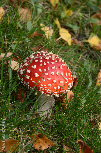 Fly agaric toadstool on a lawn, this is a very poisonous toadstool.