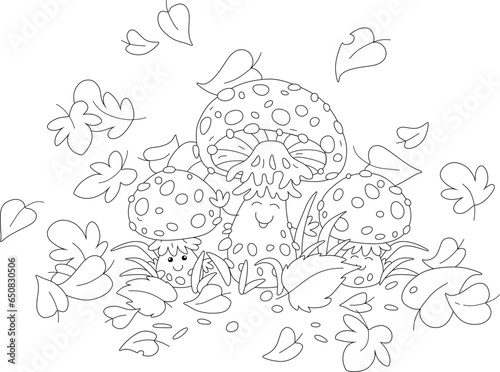 Fly agarics among grass and flying leaves in an autumn forest, funny Kawaii characters, black and white outline vector cartoon illustration for a coloring book