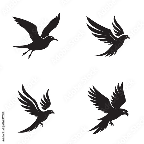 Flying and Standing Bird Silhouettes Black Vector Icons