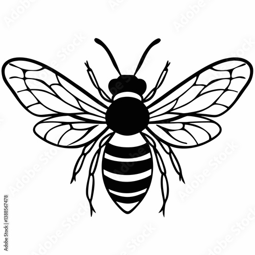 Flying bee with open wings - line art vector illustration in white background