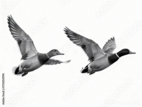 flying birds isolated on white background, ducks representing freedom, nature, and wildlife in retro pop art style