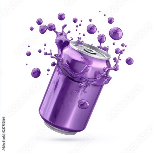 flying can of grape soda with purple bubbly splashes, isolated on a white background