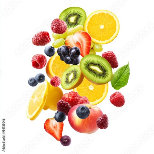 Flying different fresh fruits in air on white background. Falling fruits mix multifruit