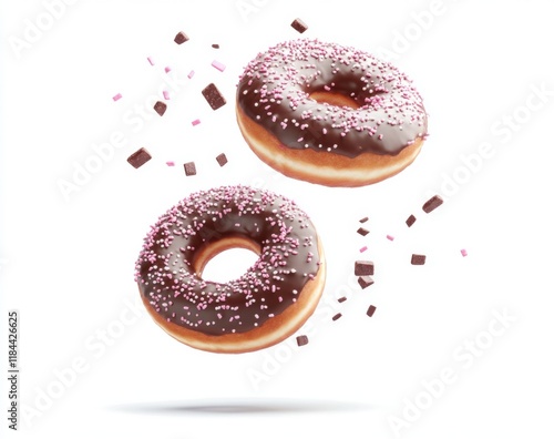 Flying Doughnuts with Chocolate and Pink Sprinkles on White Background