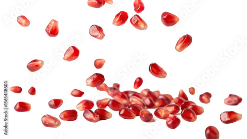 Flying falling pomegranate seeds isolated on a white background PNG. AI GENERATED.