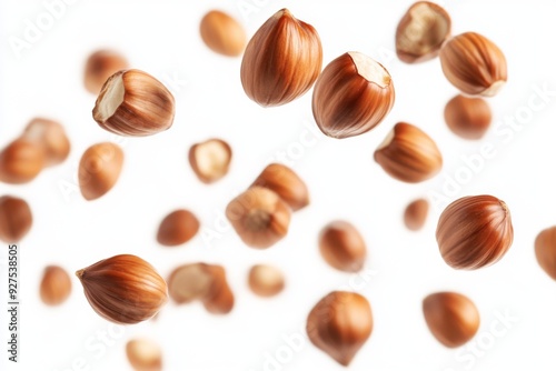 Flying in air hazelnuts isolated on white background. Falling hazelnuts