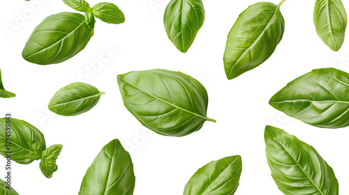 Flying or falling fresh basil leaves on transparent PNG or white background. seasoning herb leaves, cooking spices.