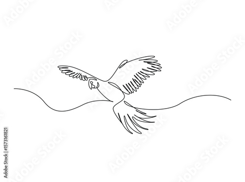 Flying parrot bird in single outline illustration. Continuous line art drawing of cockatoo bird.
