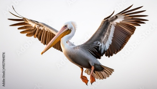 flying pelican with outstretched wings showcasing beautiful plumage on white background