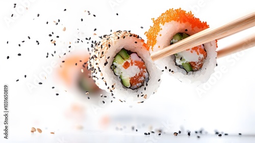 Flying pieces of sushi with wooden chopsticks, separated on white background.