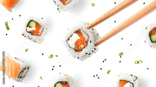 Flying pieces of sushi with wooden chopsticks, separated on white background.