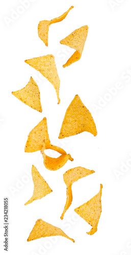 Flying potato chips and tomato isolated on white