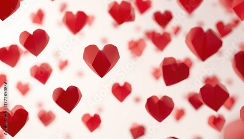 Flying red paper hearts on a white backdrop, symbolizing love and romance