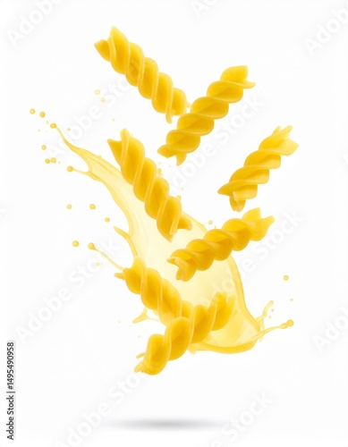 Flying rigatoni pasta with cheese and cream splash on white background