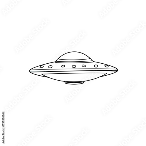 Flying saucer illustration in black and white for otherworldly travel. Flying saucer line art depicts streamlined futuristic design, a vehicle of unknown origin.