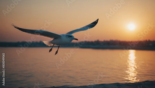 Flying seagull at sunset. Close up photo.