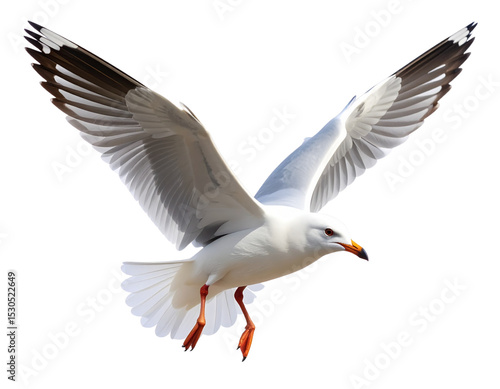 Flying Seagull with Spread Wings Gliding Mid-Air, Isolated on White Background