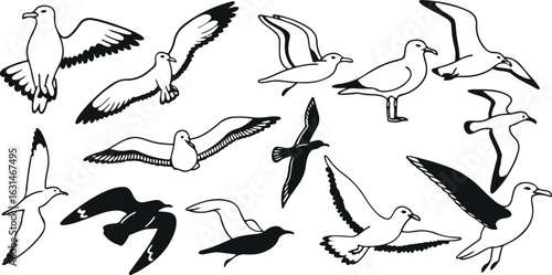 Flying Seagulls and Birds Doodle Set – Hand-Drawn Avian Art, Coastal Wildlife Sketch, Nature-Inspired Line Art