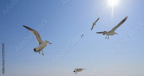 Flying seagulls over blue sky.