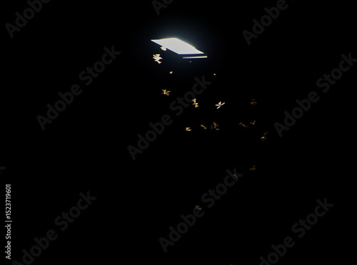 Flying termites swarm around a bright light source in the dark night.