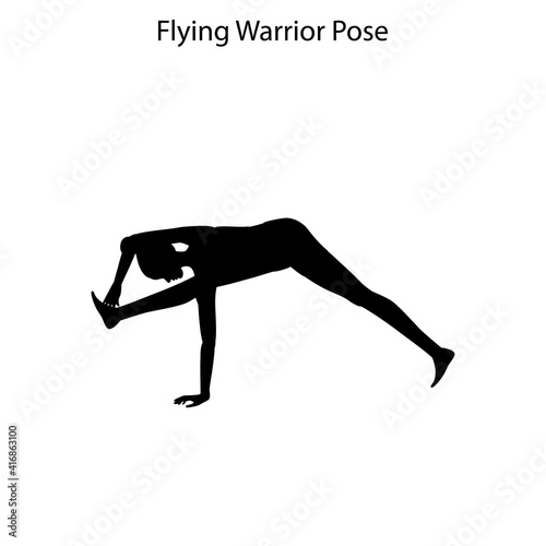Flying Warrior pose yoga workout silhouette. Healthy lifestyle vector illustration