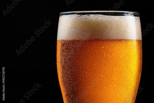 Foamy beer with amber glow and condensation on a glass set against dark backdrop, ideal for beverage branding or alcohol product shoots
