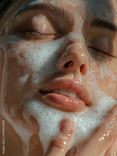 Foamy face wash being applied and rinsed, with bright lighting enhancing skin texture, clean and fresh composition