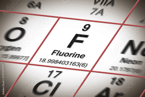 Focus on fluorine chemical element - the most important element against tooth decay - concept image with a Mendeleev periodic table