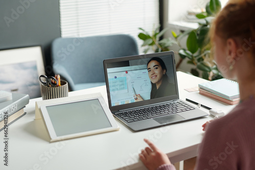 Focus on laptop screen with English teacher explaining new grammar rules on whiteboard to secondary school pupil sitting by desk at home
