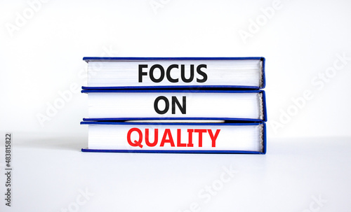 Focus on quality symbol. Concept words Focus on quality on books on beautiful white table white background. Business, focus on quality concept. Copy space.