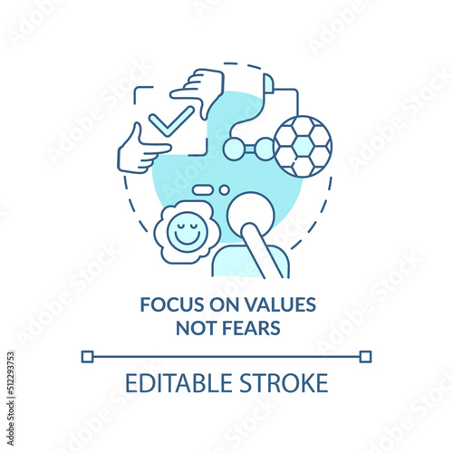 Focus on values not fears turquoise concept icon. Dealing with change abstract idea thin line illustration. Isolated outline drawing. Editable stroke. Arial, Myriad Pro-Bold fonts used