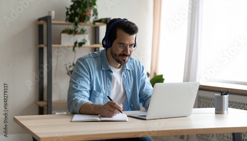 Focused 35s man sit at desk wear headphones watch webinar use laptop gain new knowledge writing notes. Video conference communication, negotiation remotely, study online. Detailed high quality image.