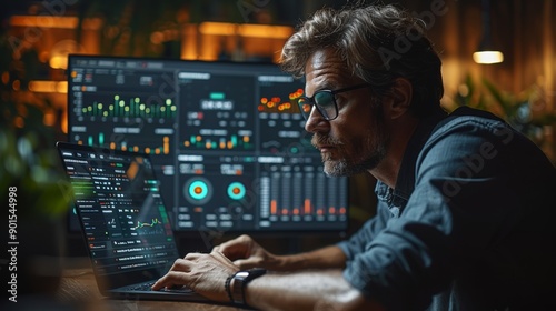 Focused Analyst Analyzing Data Trends on Laptop in Dimly Lit Office Environment at Night. Generative AI