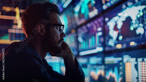 Focused analyst watching stock market data on multiple screens, highlighting finance, technology, and data analysis insights in modern workspace.