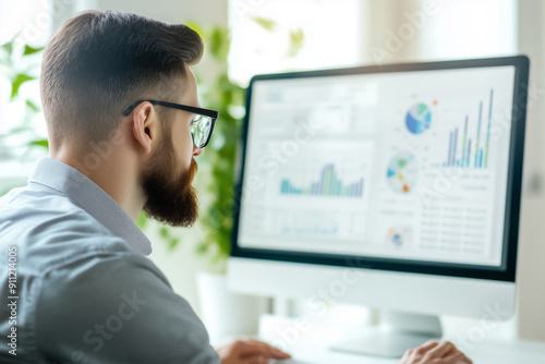 Focused and dedicated professional intently analyzing data presented on his computer screen within a modern and stylish workspace