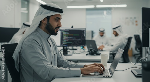 Focused Arab programmer in traditional attire works diligently on his laptop in a modern office.