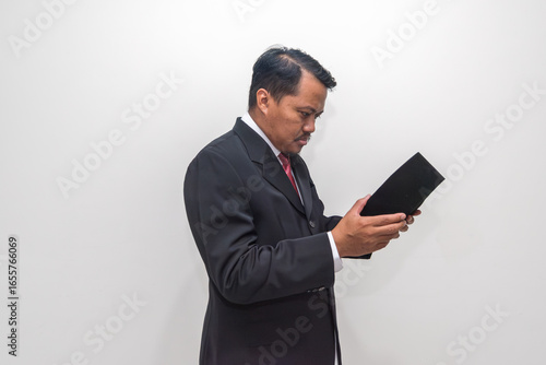 Focused Asian Businessman in a Black Suit Intently Studying a Report Against a White Background