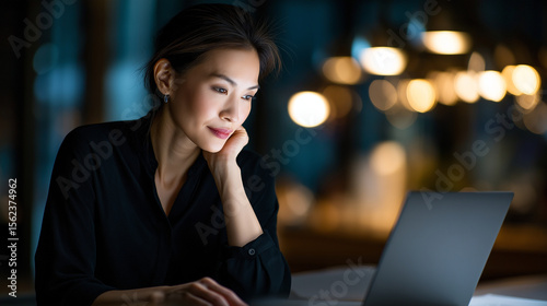 Focused Asian businesswoman participating in a virtual webinar with a laptop.