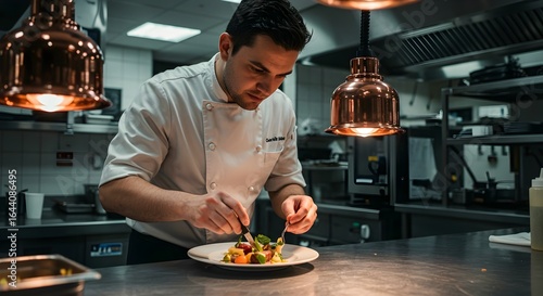 Focused Asian Male Chef Plating a Gourmet Dish in a Professional Kitchen