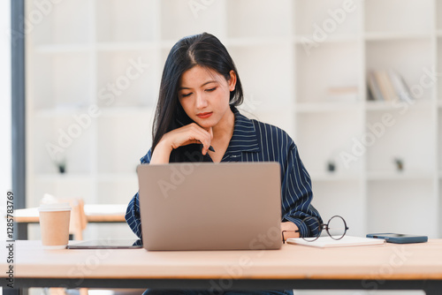 Focused Asian woman working on laptop at desk in modern office environment.