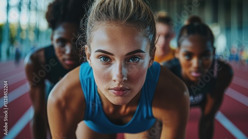 Focused Athlete in Blue Eyes Stays Ahead of Competition on Track Surrounded by Determined Runners in Dynamic Sports Environment