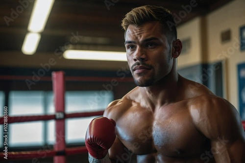 Focused boxer training in gym, showcasing determination and strength during workout session at local boxing facility.