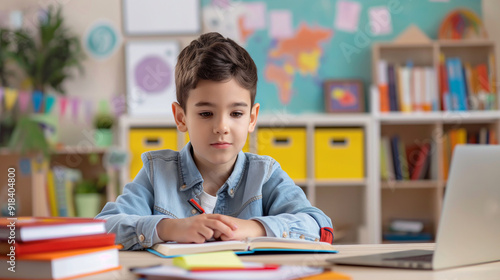 Focused boy studying with laptop and books at home