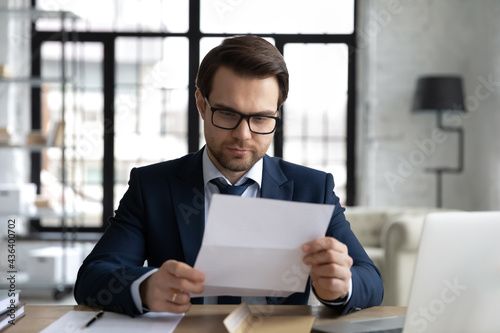 Focused business leader in formal suit and glasses reading letter, receiving official document, bank or insurance notice, contract, agreement, certificate, invitation. Paperwork, mail concept