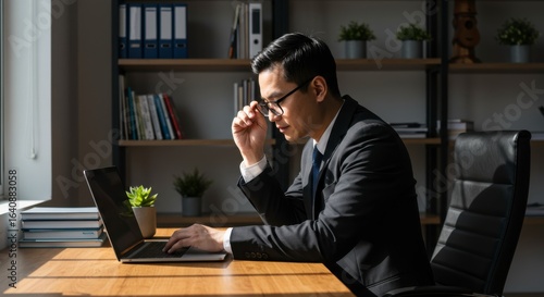 Focused business professional working on laptop in modern office setting engaged in strategy development indoor workspace serious atmosphere for productivity