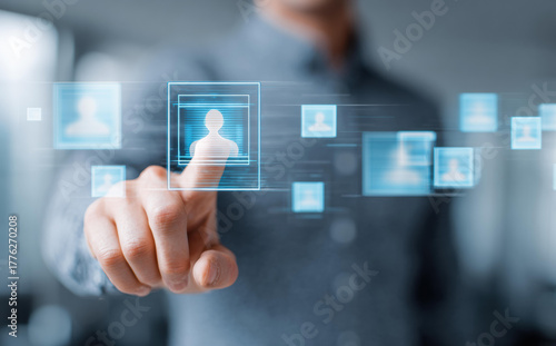 Focused businessman hand touching virtual screen for human resource management. Professional manager selecting candidate profile for recruitment on futuristic interface