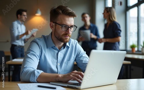 Focused businessman working on laptop in modern office with colleagues discussing in background. High quality