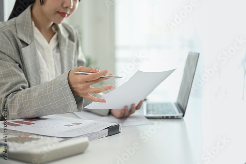 Focused businesswoman in suit analyzing investment data at workplace