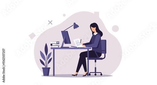 Focused businesswoman working diligently at her desk with a computer and papers, illuminated by a desk lamp.
