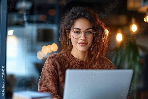 Focused businesswoman working on laptop in modern office smiling doing online banking analysis